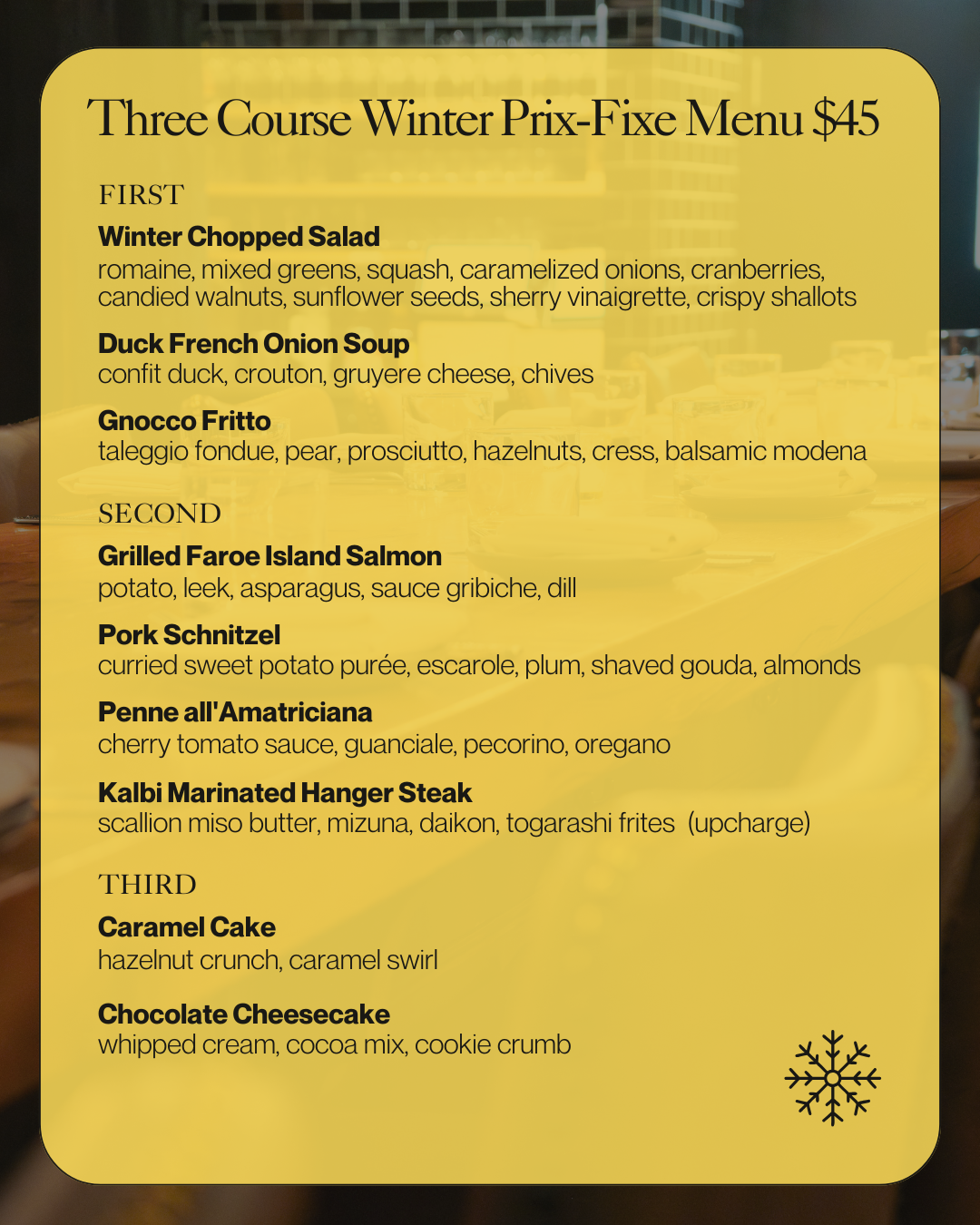 Starting February 18th join us for a special prix-fixe menu option for $45 per person in addition to our a la carte menu on Wednesdays, Thursdays and Sunday Nights!