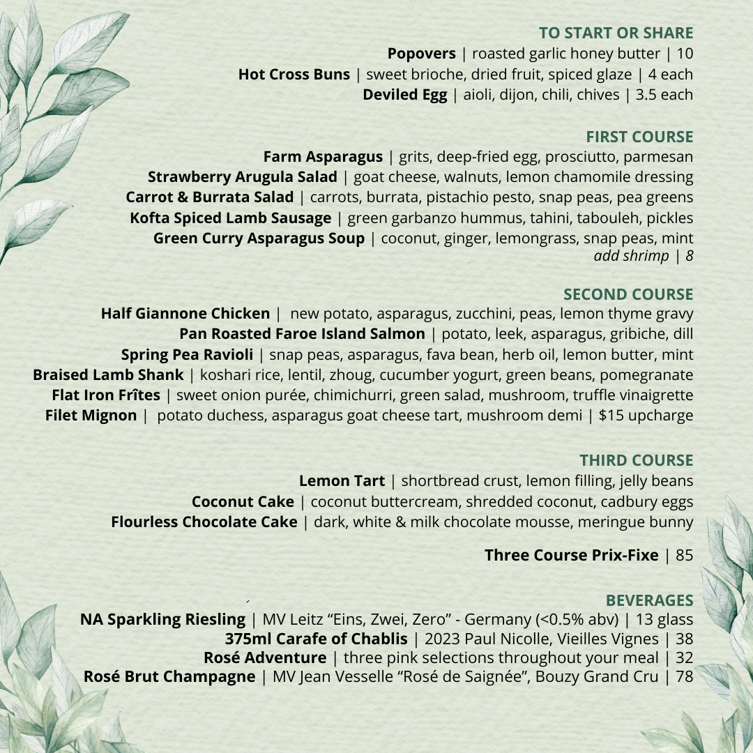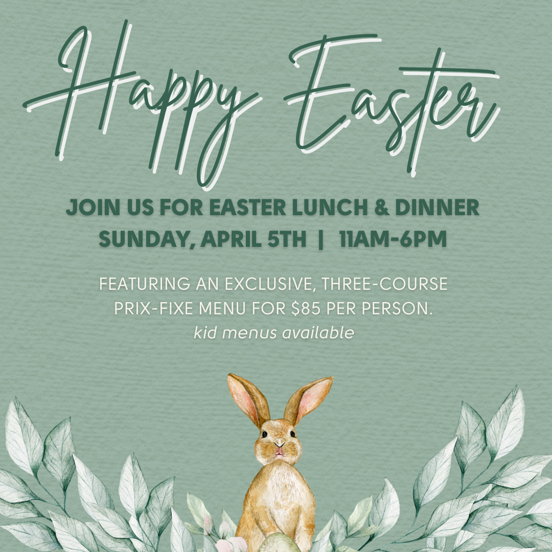 Join us on Sunday, April 5th for an exclusive all day lunch & dinner prix-fixe menu for $85 per person with kid menus also available. Book now on Opentable or call us!